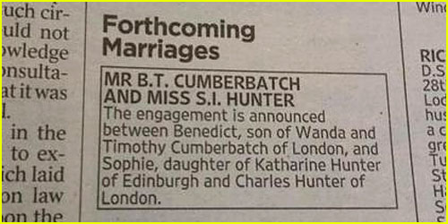 今日的泰晤士报上出现了一条定婚启示,而定婚的两位则是38岁的卷福Benedict Cumberbatch与36岁的Sophie Hunter,之前从未有正式消息证明这两位确实在约会,但是他们曾经多次被发现在一起,订婚启事上二位父母的名字都准确无误,所以,你相信吗?