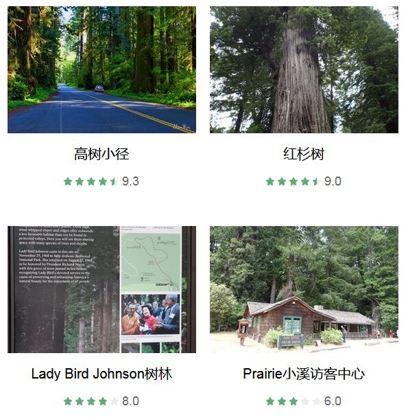 高树小径 、 红杉树 、 Hiouchi游客中心 、 Enderts海滩 、 Lady Bird Johnson树林 、 Prairie小溪访客中心