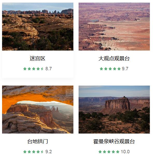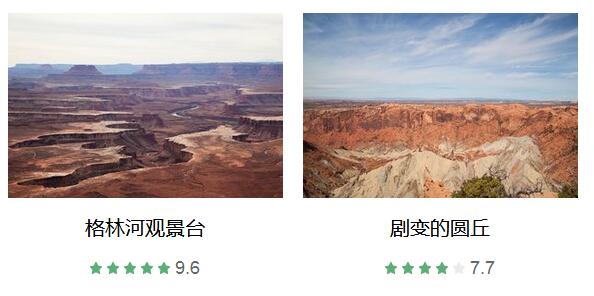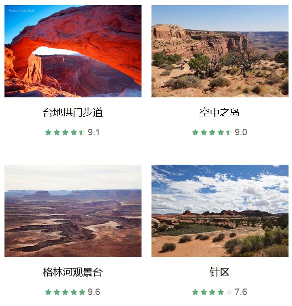 台地拱门步道 、 空中之岛 、 迷宫区 、 大观点观景台 、 格林河观景台 、 针区 、 台地拱门 、 霍曼泉峡谷观景台 、 剧变的圆丘 、 巴克峡谷观景台 、 鲸鱼石 、 Fossil Point