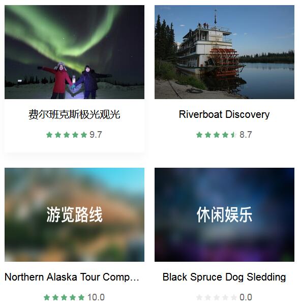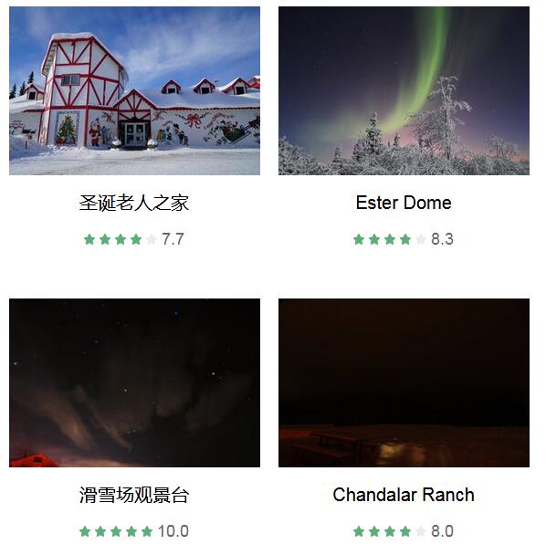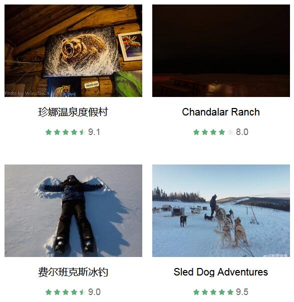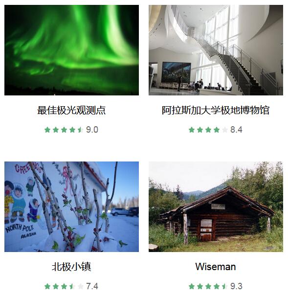 最佳极光观测点 、 阿拉斯加大学极地博物馆 、 珍娜温泉度假村 、 圣诞老人之家 、 Ester Dome 、 北极小镇 、 Wiseman 、 滑雪场观景台 、 Chandalar Ranch 、 费尔班克斯国际机