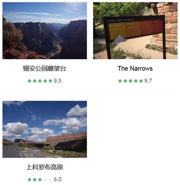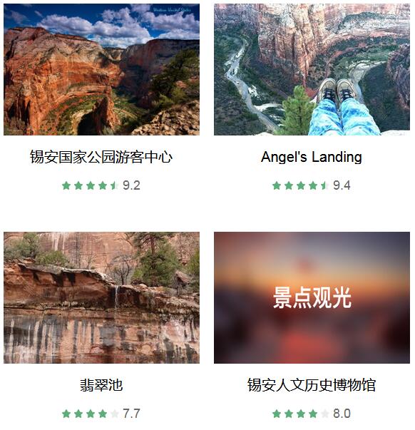 锡安国家公园游客中心 、 Angel's Landing 、 锡安公园瞭望台 、 The Narrows 、 穿梭巴士游宰恩公园 、 翡翠池 、 Canyon Overlook Trail 、 锡安人文历史博物馆 、 上科罗布高原