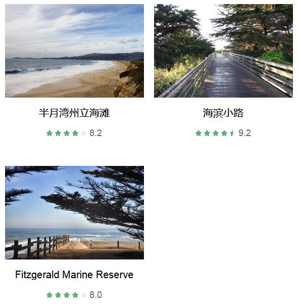 半月湾州立海滩 、 海滨小路 、 Pescadero海滩 、 Miramar海滩 、 Fitzgerald Marine Reserve 、 莱莫斯农场 、 半月湾高尔夫训练营 、 Flying Fish Bar And Gril