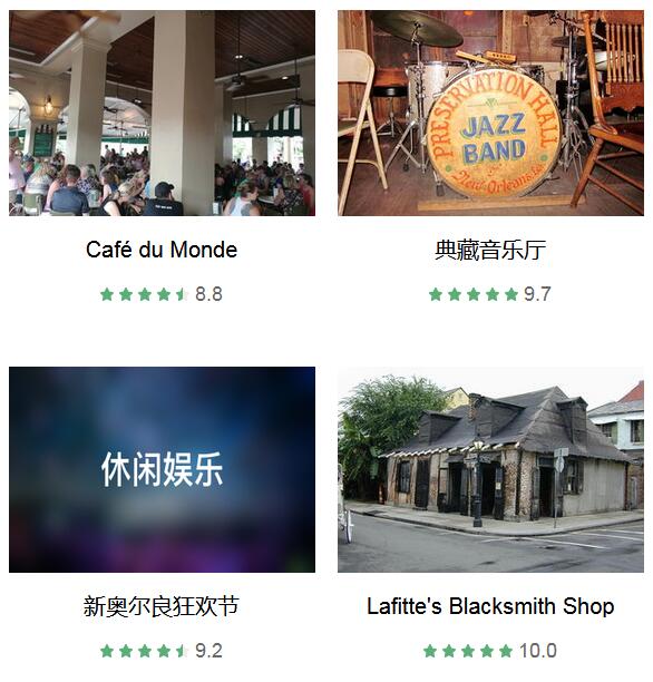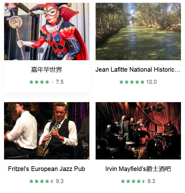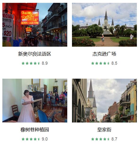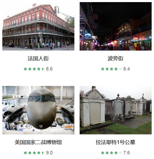 新奥尔良法语区 、 杰克逊广场 、 法国人街 、 波旁街 、 橡树巷种植园 、 皇家街 、 美国国家二战博物馆 、 Café du Monde 、 拉法耶特1号公墓 、 Lake Pontchartrain Causeway
