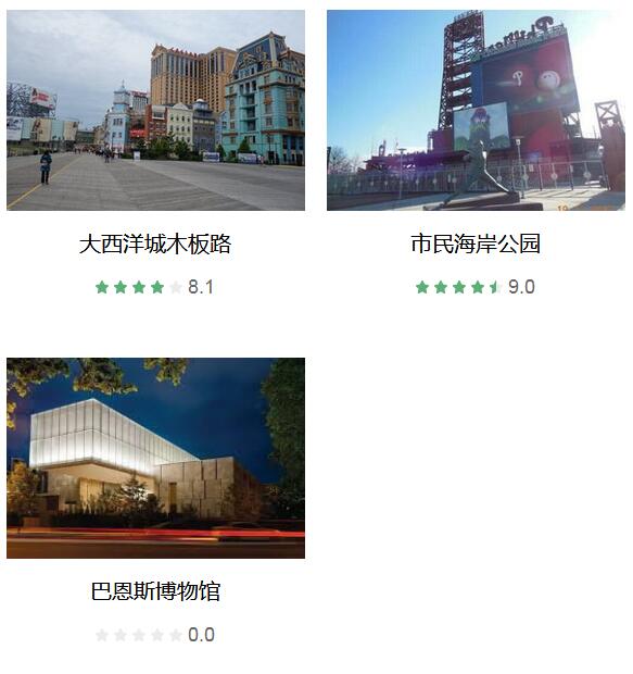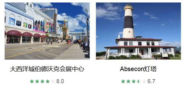 大西洋城木板路 、 市民海岸公园 、 大西洋城伯德沃克会展中心 、 Borgata赌场 、 Absecon灯塔 、 巴恩斯博物馆 、 Dock's Oyster House 、 Legends In Concert 、 热带酒店