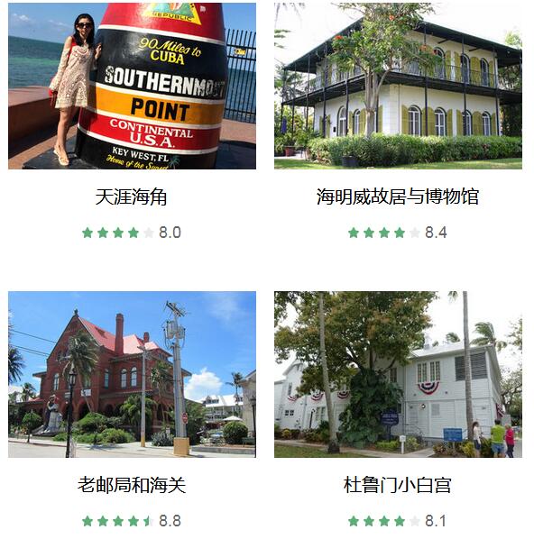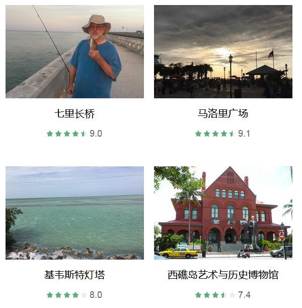 天涯海角 、 海明威故居与博物馆 、 七里长桥 、 马洛里广场 、 老邮局和海关 、 杜鲁门小白宫 、 基韦斯特灯塔 、 西礁岛艺术与历史博物馆 、 美国1号公路 、 西礁岛蝴蝶温室