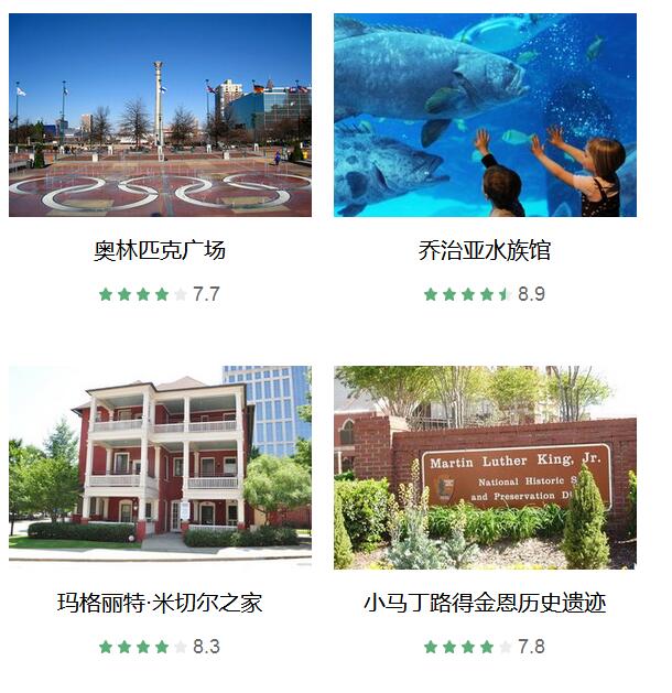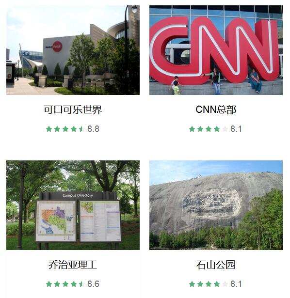 可口可乐世界 、 CNN总部 、 奥林匹克广场 、 乔治亚水族馆 、 乔治亚理工 、 石山公园 、 玛格丽特·米切尔之家 、 小马丁路得金恩历史遗迹 、 亚特兰大哈茨菲尔德-杰克逊国际机场