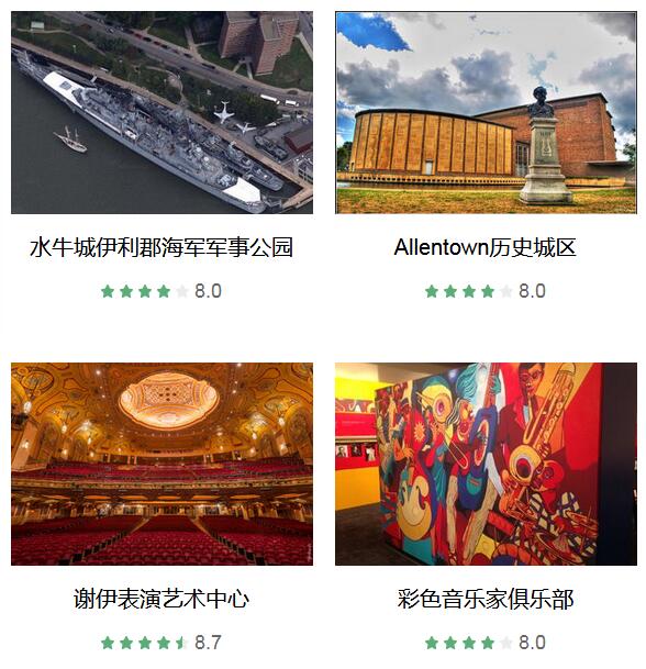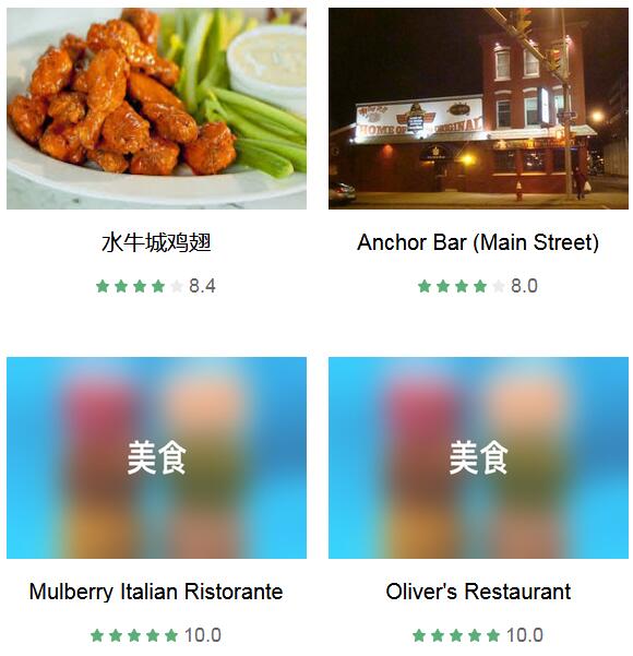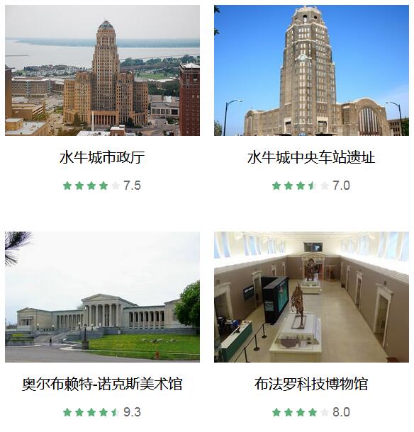 水牛城市政厅 、 水牛城中央车站遗址 、 水牛城伊利郡海军军事公园 、 布法罗尼亚加拉国际机场 、 Allentown历史城区 、 水牛城鸡翅 、 奥尔布赖特-诺克斯美术馆