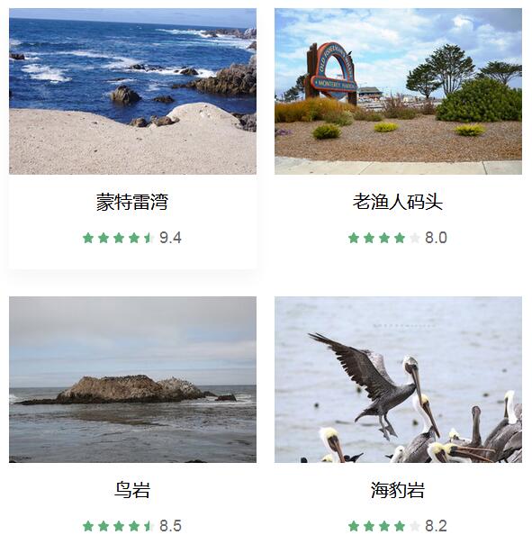 蒙特雷湾 、 老渔人码头 、 圆石滩 、 The Lone Cypress 、 鸟岩 、 海豹岩 、 蒙特雷湾水族馆 、 情人角公园 、 蒙特雷半岛休闲远足路线 、 加拉帕塔海滩 、 Pebble Beach Golf Links